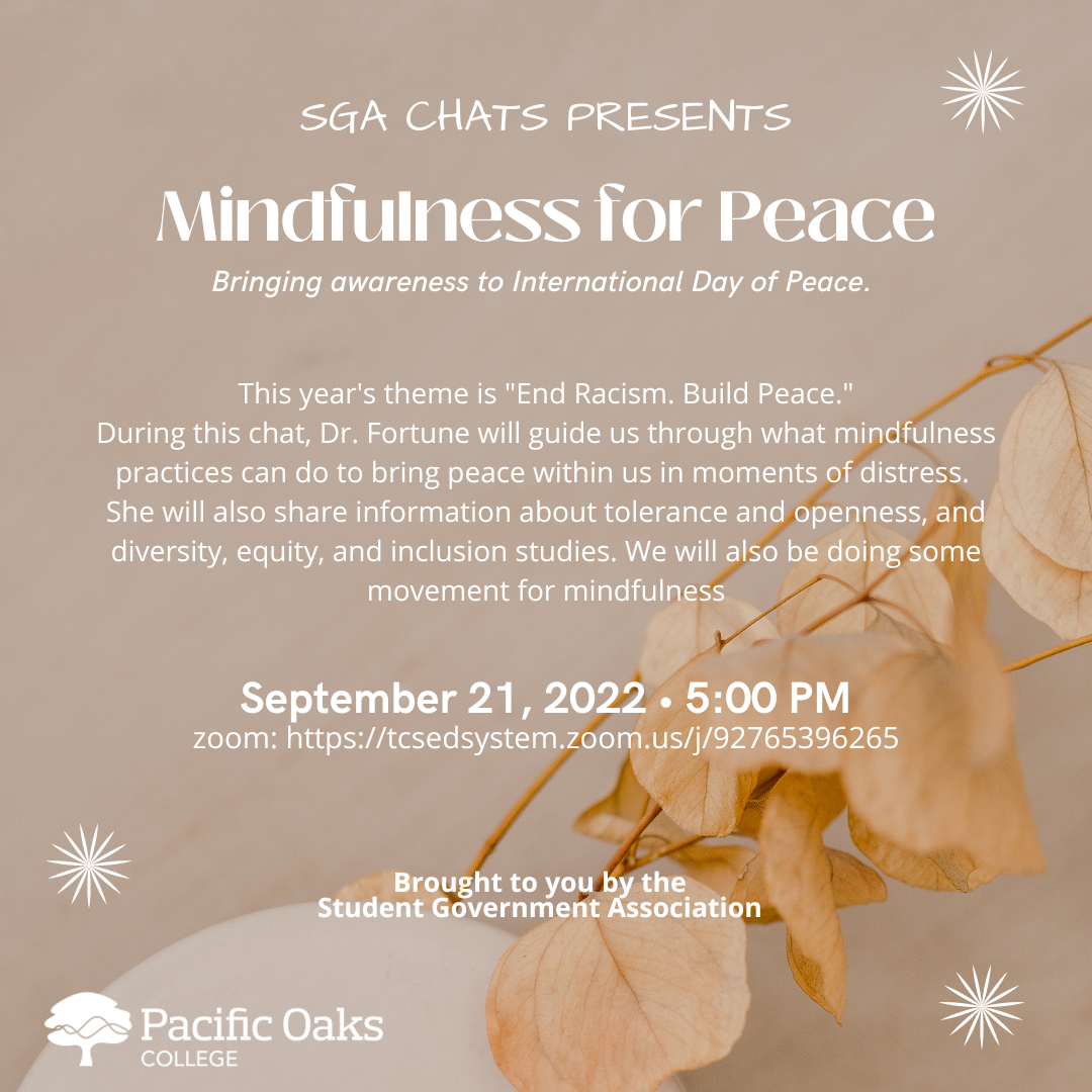 At Pacific Oaks College I am speaking about Mindfulness for Peace on Sept 21, sponsored by their student government. It is a virtual event and open. The flyer contains details on how to register.