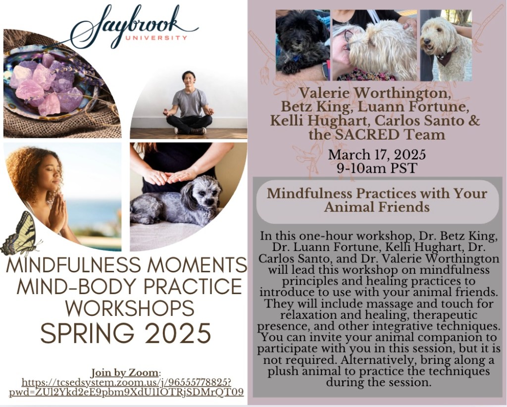 We invite you to join us for a one-hour Mindfulness Moment workshop on March 17, 2025 at 9am. PST/12noon EST. with the Saybrook faculty on Mindfulness Practices with your animal friends